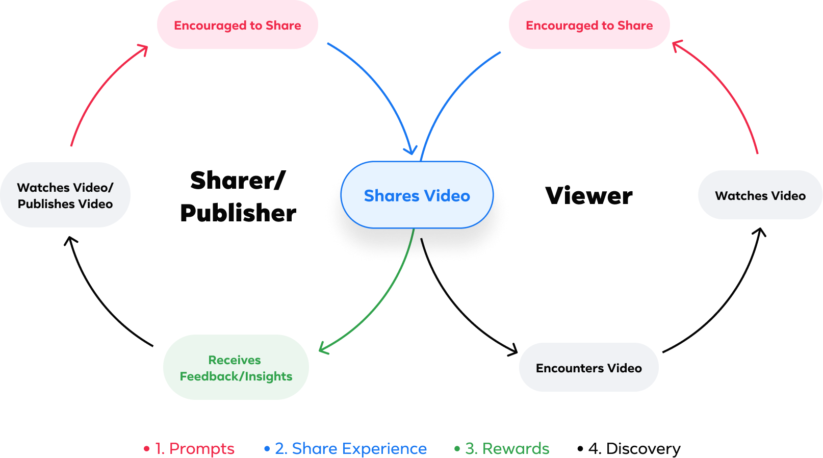 Inspired by the insights from user research, we adopted Nir Eyal's Hooked Model to encourage a habit of sharing and address the reshare problem, ultimately creating an easy-to-understand product strategy. The model consists of four stages: prompts, share experience, rewards, and discovery. We divided the sharing journey into two paths: sharers and viewers/recipients. The sharer's journey includes watching/publishing a video (discovery), being encouraged to share (trigger), sharing the video (action), and receiving feedback/insights (reward). The viewer's journey involves encountering a video (discovery), watching the video (discovery), being encouraged to share (trigger), and sharing the video (action).